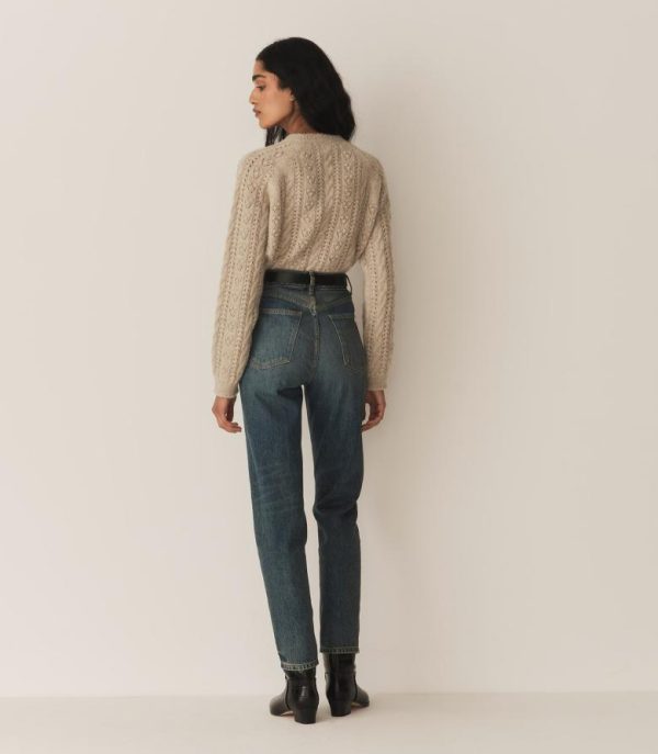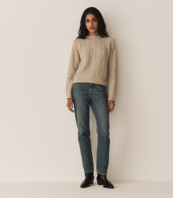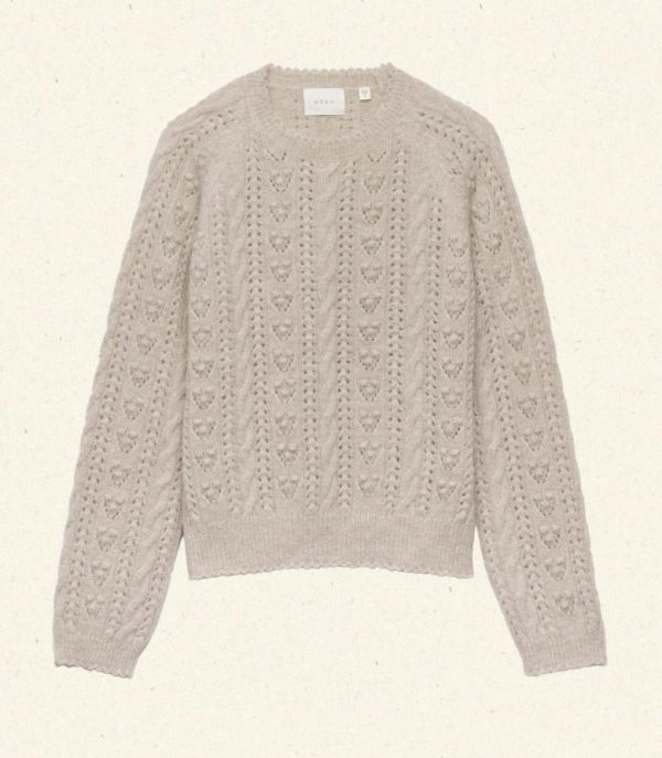 In a soft baby alpaca-wool blend, our Langley Sweater features a classic crew neck, full-length raglan sleeves, an intricate allover cable-pointelle design, and scalloped edges at the neckline, cuffs, and hem.