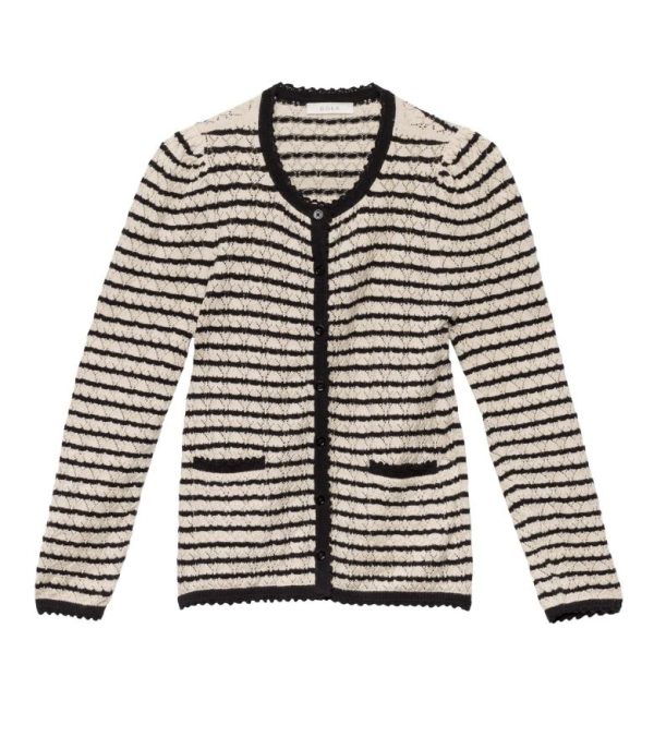 Crafted from a soft, lightweight blend of Pima cotton and silk, the ‘30s-inspired Therese Cardigan features a crew neckline, fitted full-length sleeves with shirring at the shoulders for subtle volume, mother-of-pearl buttons, and an allover pointelle design. The neckline, sleeve cuffs, center front placket, and hemline are adorned with scallop crochet detailing.
