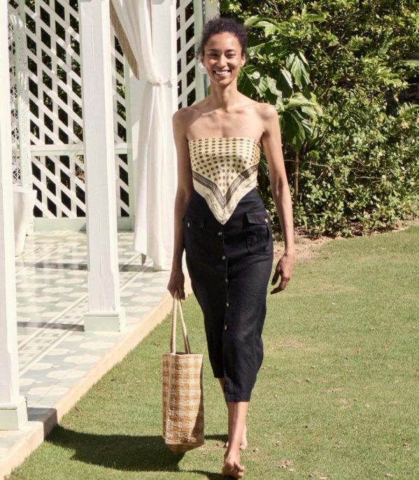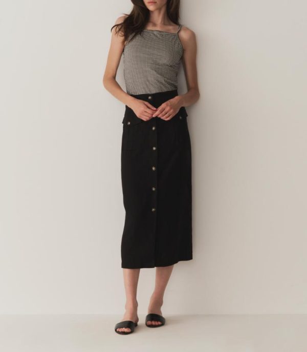 Tailored in soft midweight linen, the Lourdes is a ‘40s-inspired pencil skirt. It features a high waist, a midi-length hem, and two patch pockets with button closures. Faux horn buttons extend down the front.