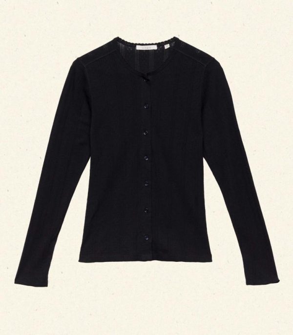 In the softest 100% organic cotton pointelle, the ‘90s-inspired Amelie Tee features a classic crew neck, full-length sleeves, a fitted silhouette, and mother-of-pearl buttons.